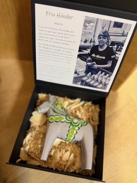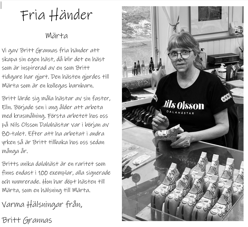 Britts unika dalahäst är en raritet som finns endast i 100 exemplar, alla signerade och numrerade. Hon har döpt hästen till Märta, som en hälsning till Märta.