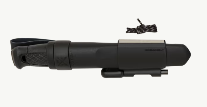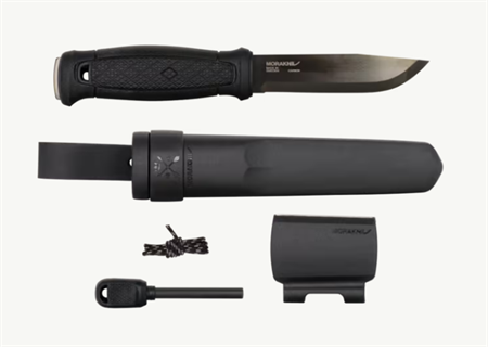Det ergonomiska spolformade skaftet av polymer har ett friktionsgrepp, fingerskydd och ett 3,2 mm tjockt blad av kolstål, som ger både styrka och stabilitet i varje skär. Den svarta DLC-beläggningen skyddar till viss del mot rost och förhindrar reflektioner i bladet. Tack vare blad- och skaftkonstruktionen blir kniven optimal för att kunna arbeta säkert och effektivt i olika väderförhållanden året runt. Knivslidan av polymer är symmetrisk, vilket innebär att den passar både höger- och vänsterhänta samt har en läderstropp av svenskt vegetabiliskt garvat läder som enkelt kan fästas på bältet. Monterat på knivslidan sitter ett Survival Kit utrustat med integrerat tändstål, diamantbryne och reflex-paracord. Optimerad och redo för oväntade utmaningar. Kolstål rostar, torka av och olja in bladet efter användning. Kompatibelt med Morakniv Multi-Mount Kit till Garberg.