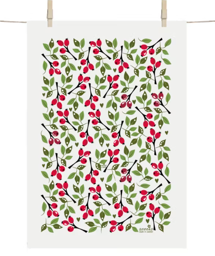 Med sitt ljuvliga nyponmönster i varma röda toner, fångar denna kökshandduk känslan av sensommar och höst i den svenska naturen. Designad av Anneli Asplund, inspirerad av nyponbuskar som klär landskapet och skapar en tidlös skönhet. Perfekt för att addera en mjuk och naturnära känsla i ditt kök.